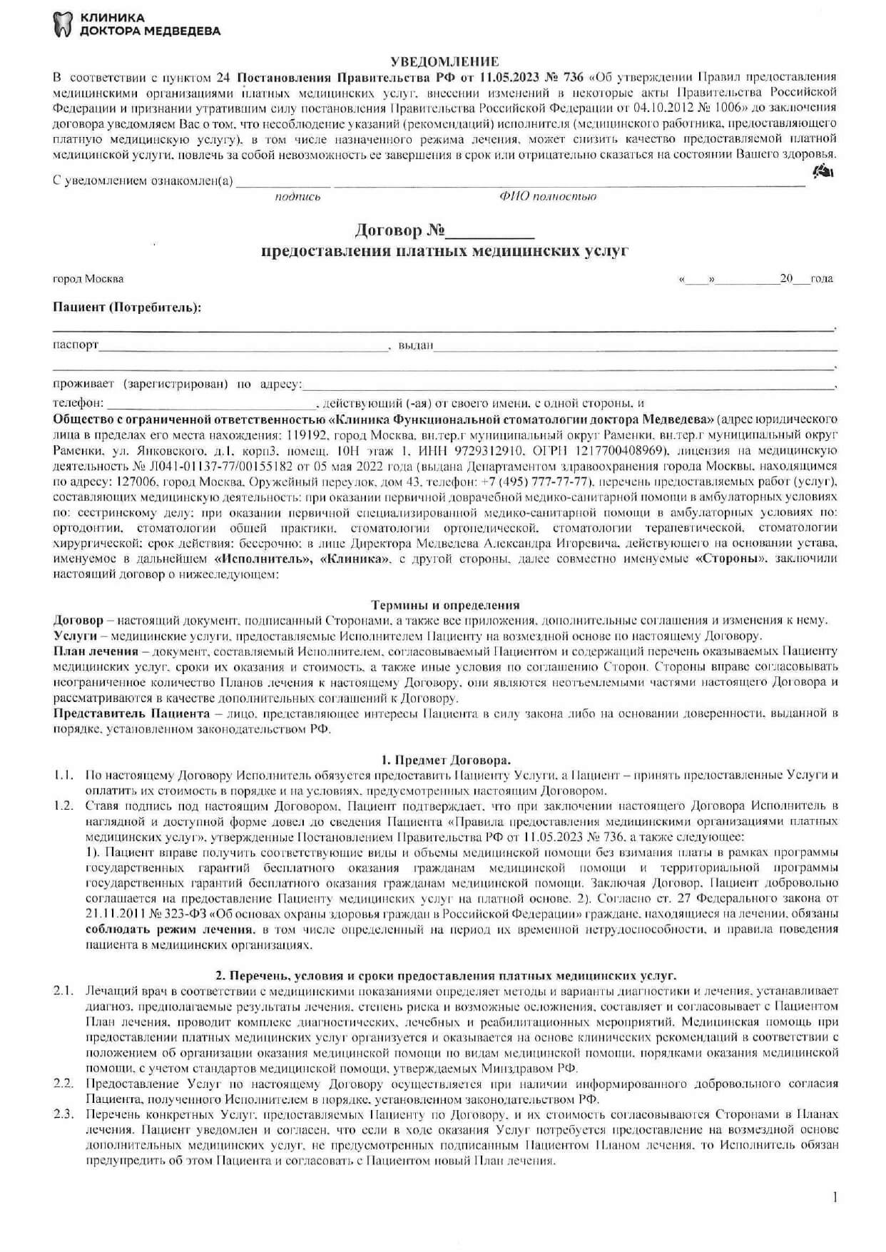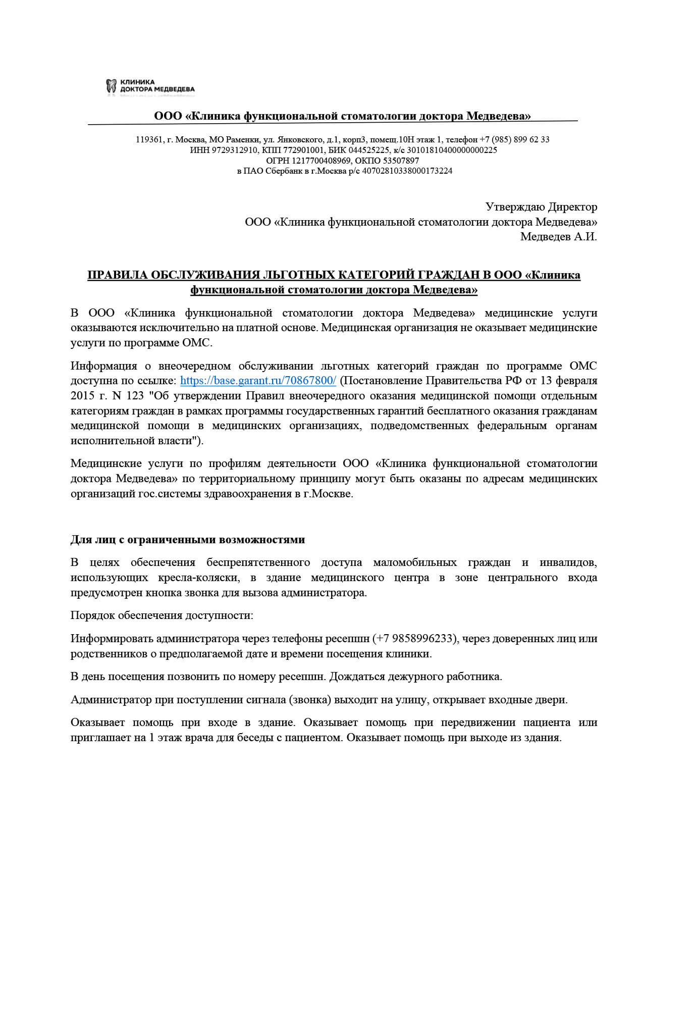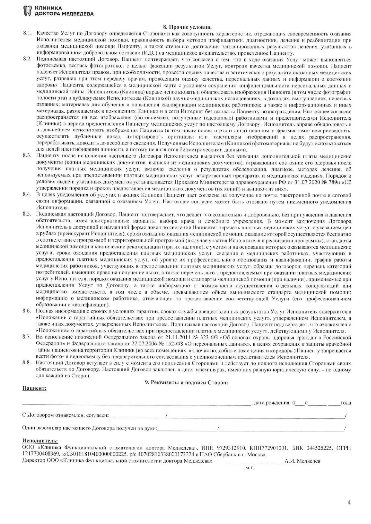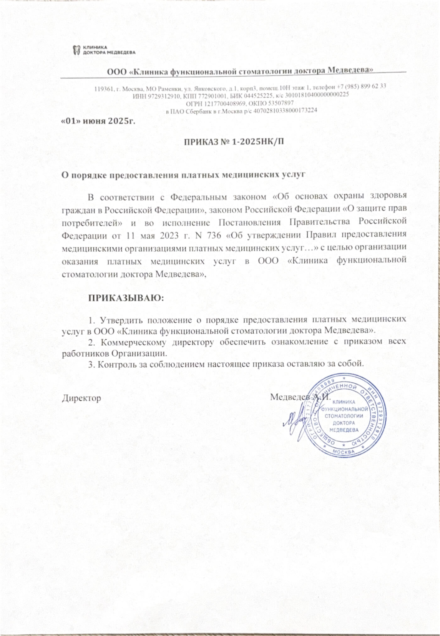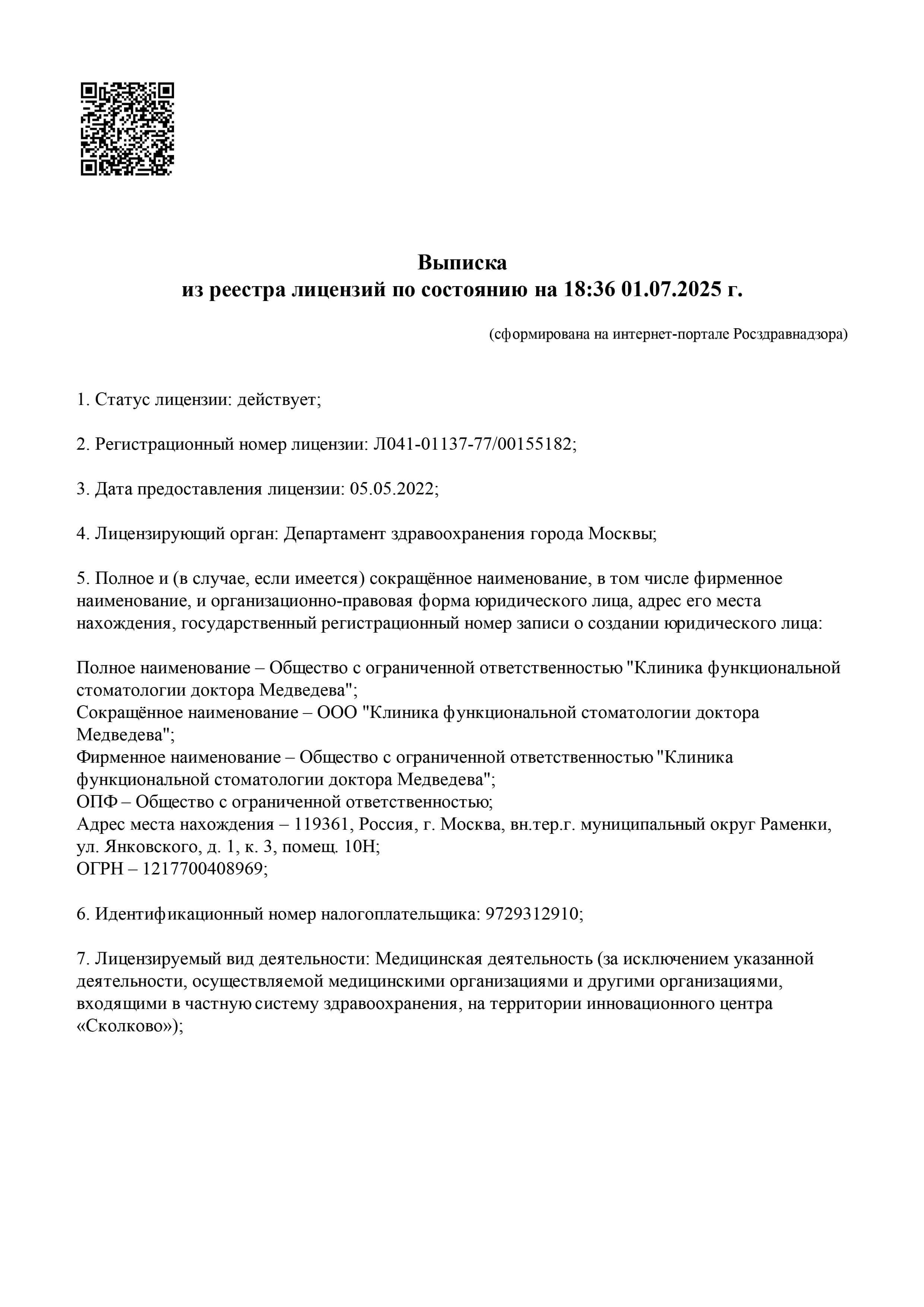 Полное наименование организации: | ООО «Клиника функциональной стоматологии доктора Медведева» |
