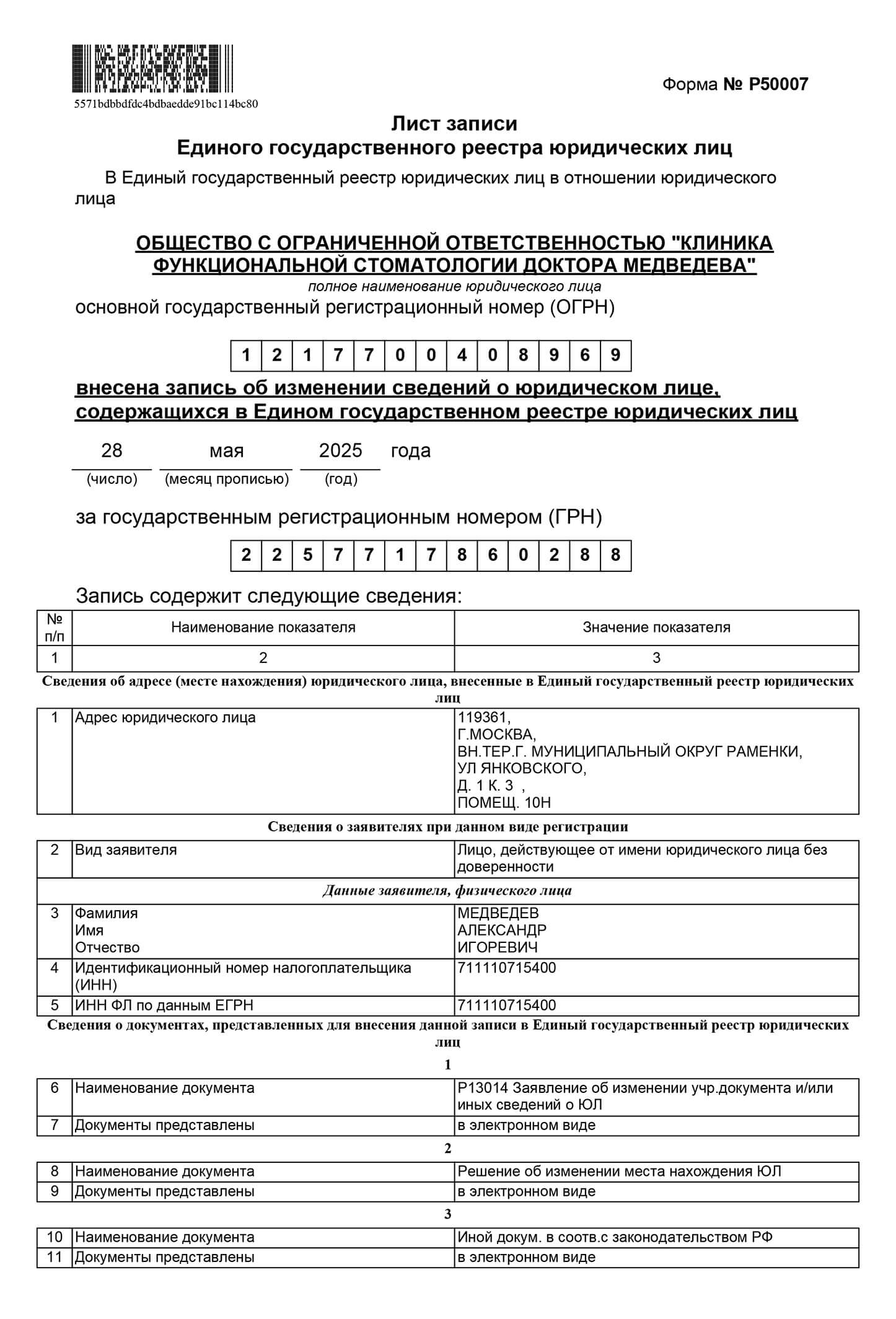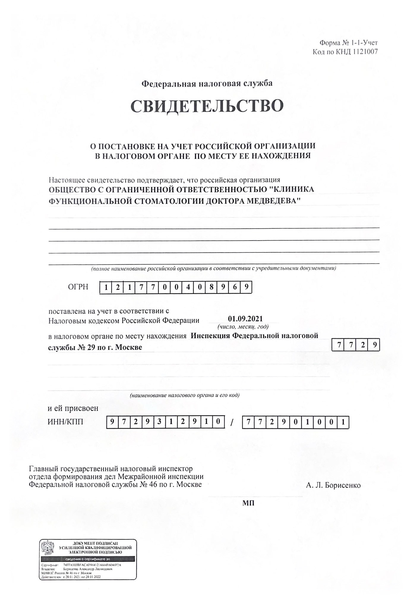 Сокращенное наименование организации: | ООО «Клиника функциональной стоматологии доктора Медведева» |